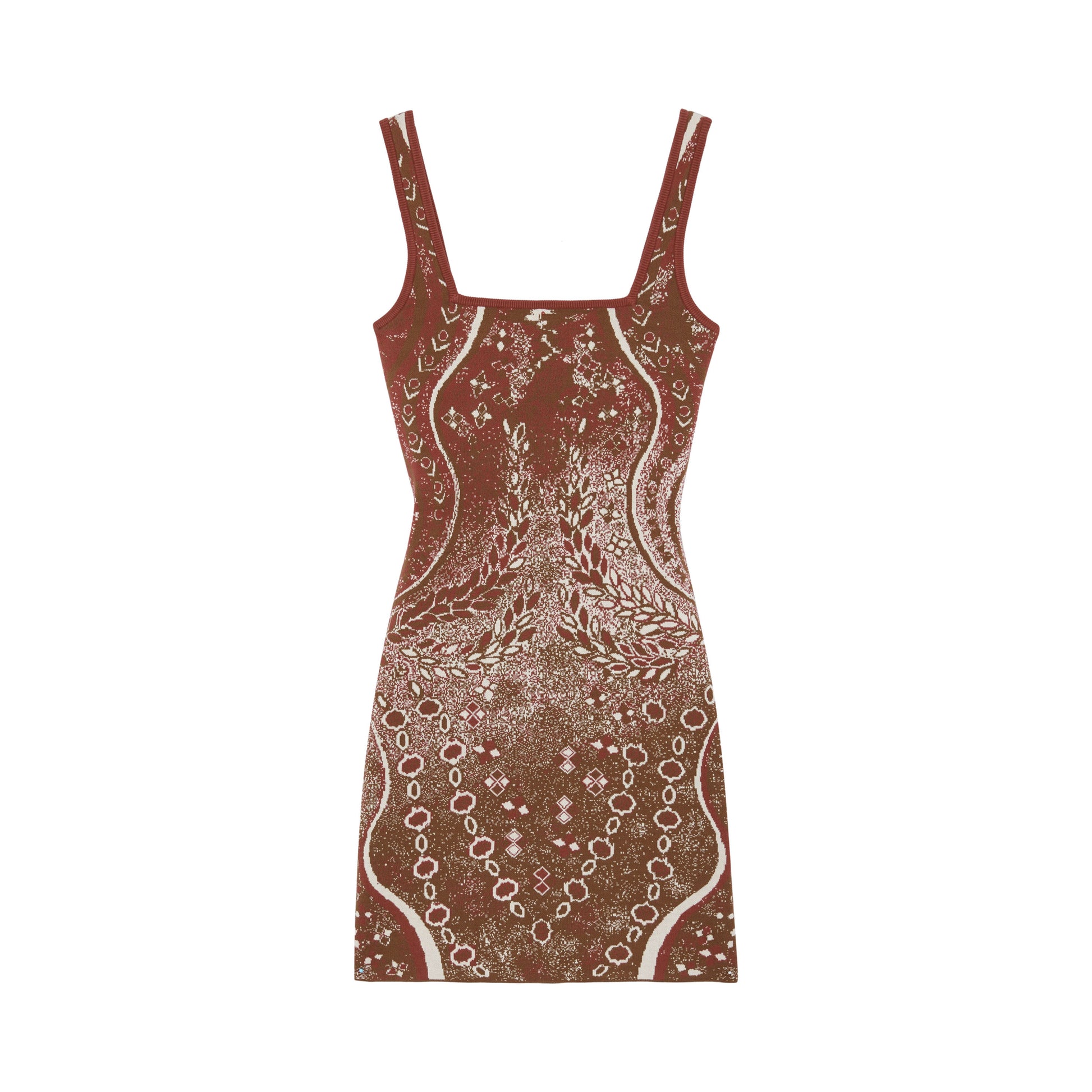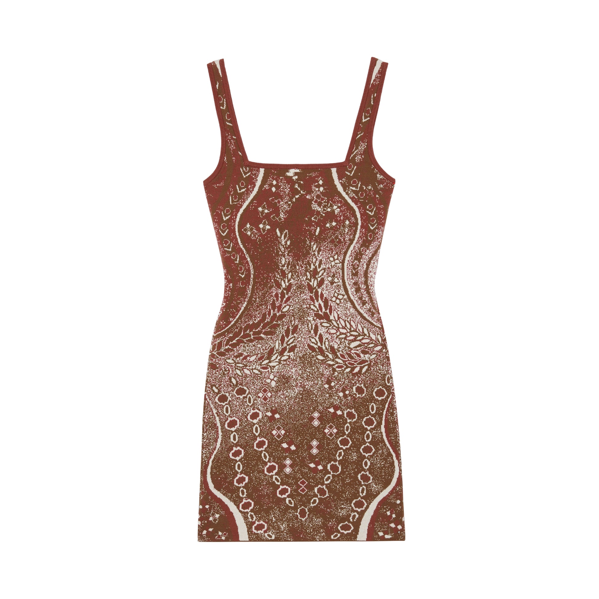 Woven from a jacquard of tonal warm browns and ivory viscose yarns, the Anjali Knitted Mini Dress features a sleek, fitted silhouette that contours the body. Inspired by romantic Bollywood motifs and intricate Nigerian gele patterns, it’s finished with tonal narrow ribbing at the neck and armholes for a subtle, elegant touch.