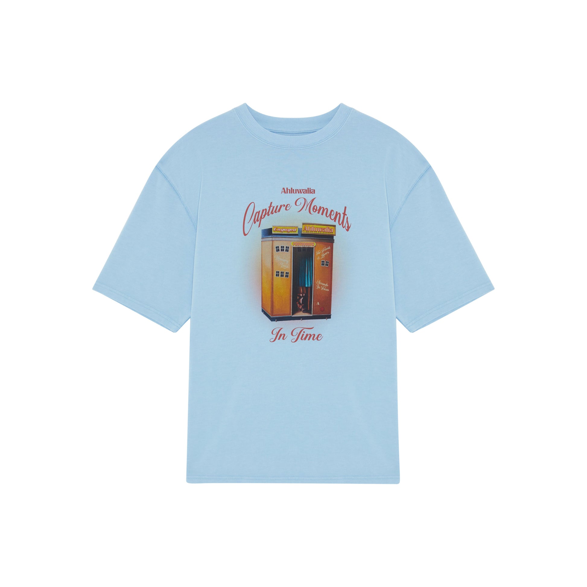This season’s graphic t-shirt showcases the ‘Capture Moments in Time’ artwork, depicting a photobooth exterior with a charming detail of a couple’s feet playfully peeking out—capturing candid, joyful moments of intimacy. Made from 100% organic cotton in a soft baby blue shade.