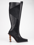 The Chikari boots are crafted in tonal black with patchwork designed to make a statement. Made in leather and suede featuring a panel with smooth black leather upto the knee. Finished with a heel crafted with designs inspired by musical instruments and a dark brown sole.