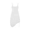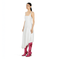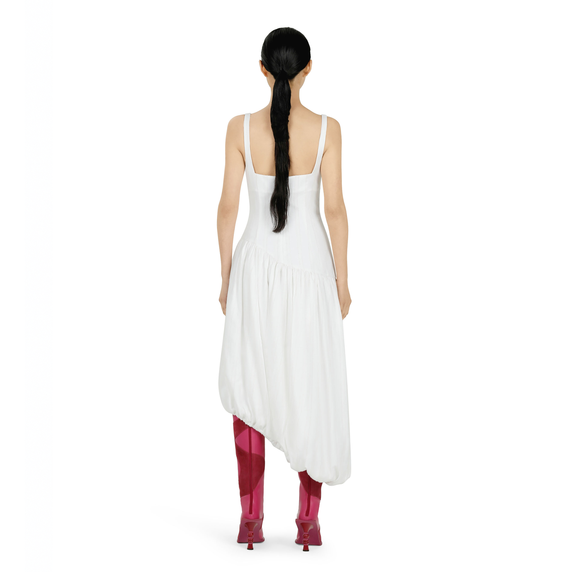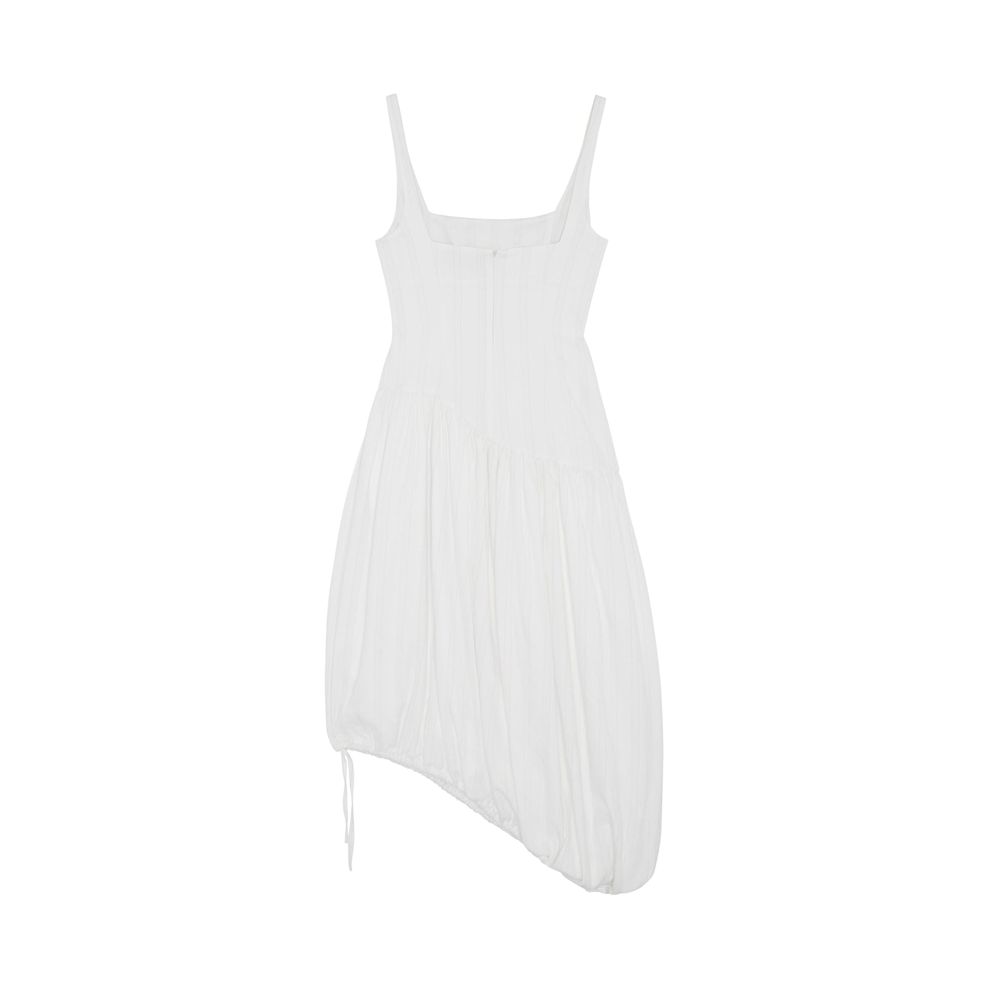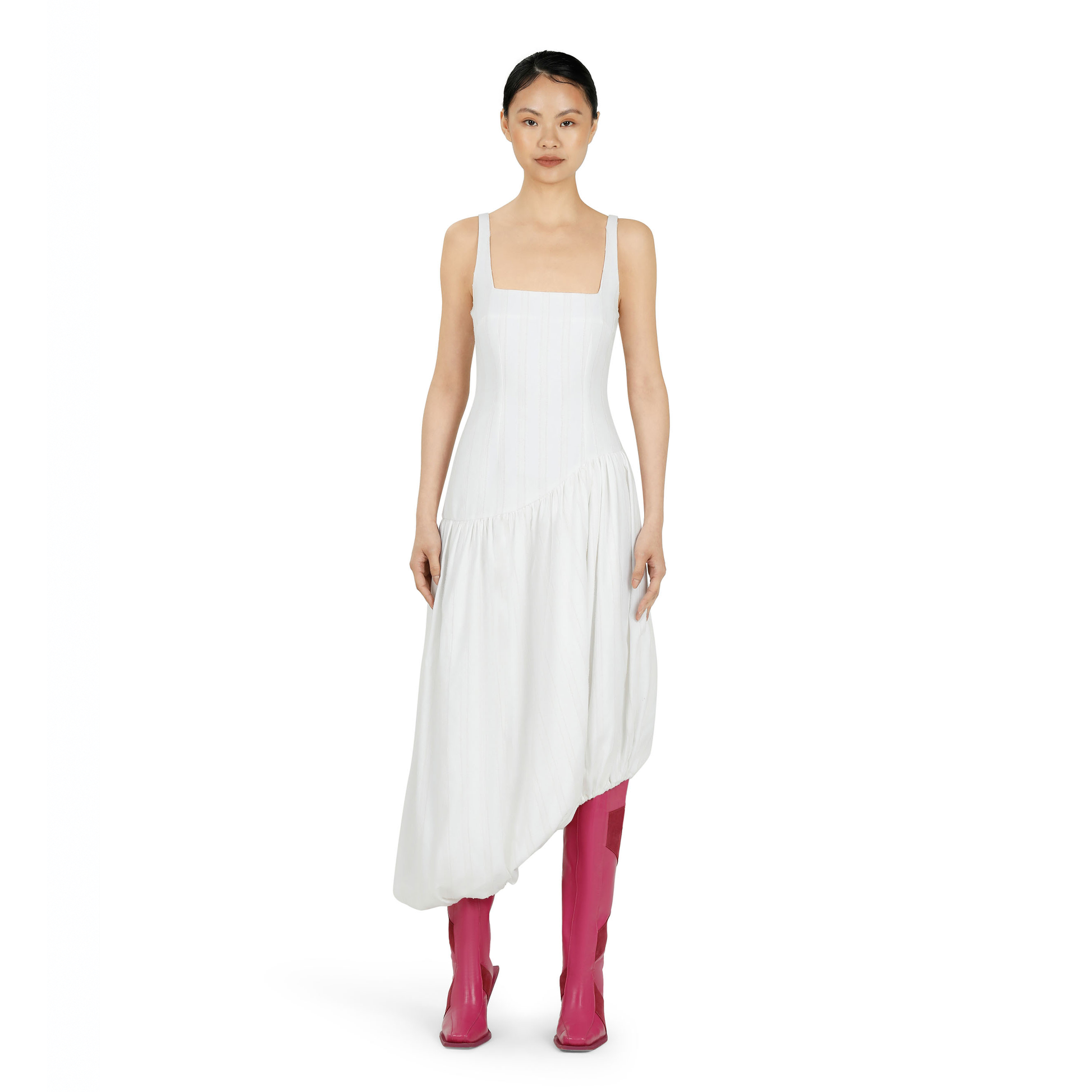 Featuring a square neckline and fitted bodice, the Diana Dress curves into a dropped waistline that flows into an asymmetrical, voluminous skirt. Made from striped off-white cotton, it moves effortlessly and is designed to transition from day to night with ease.