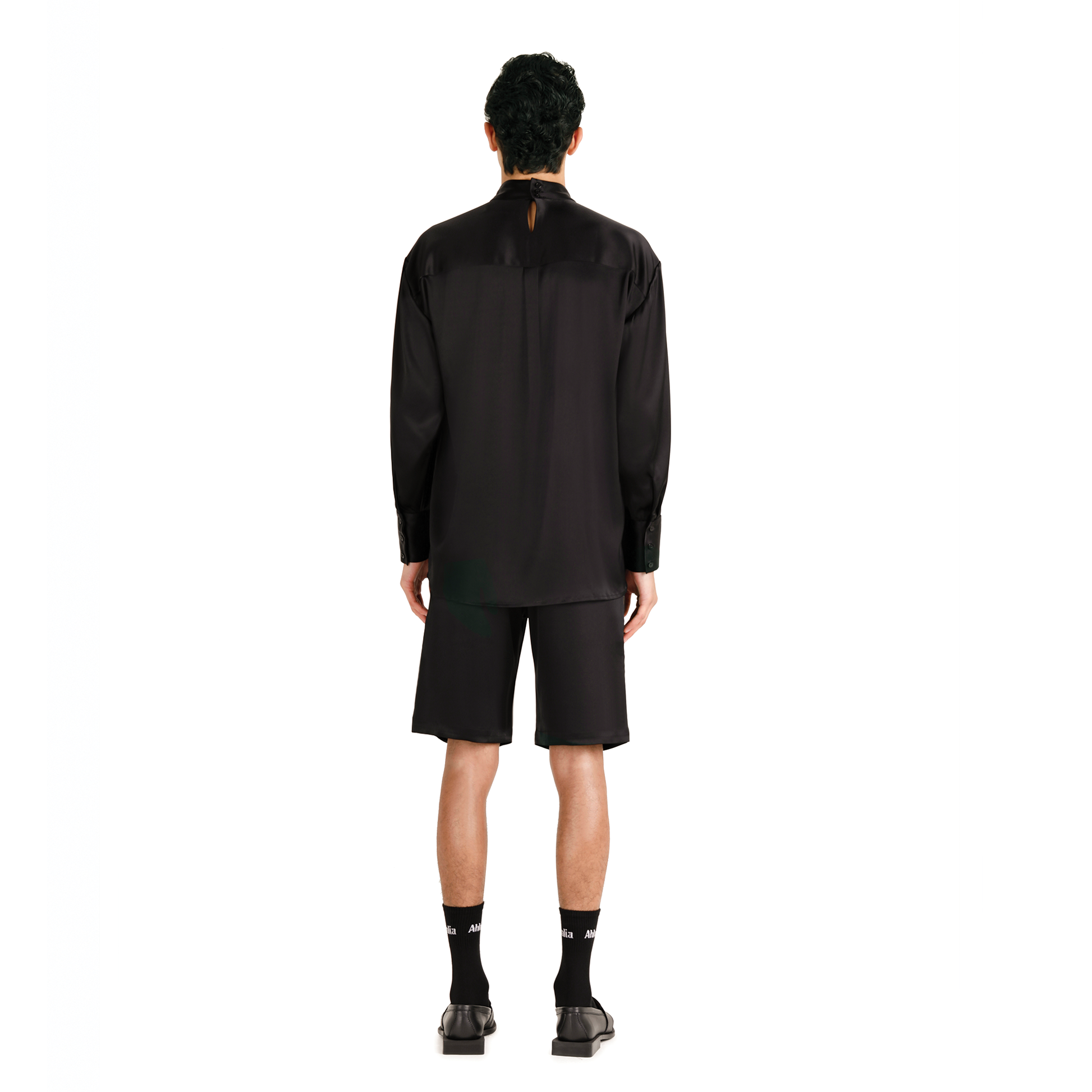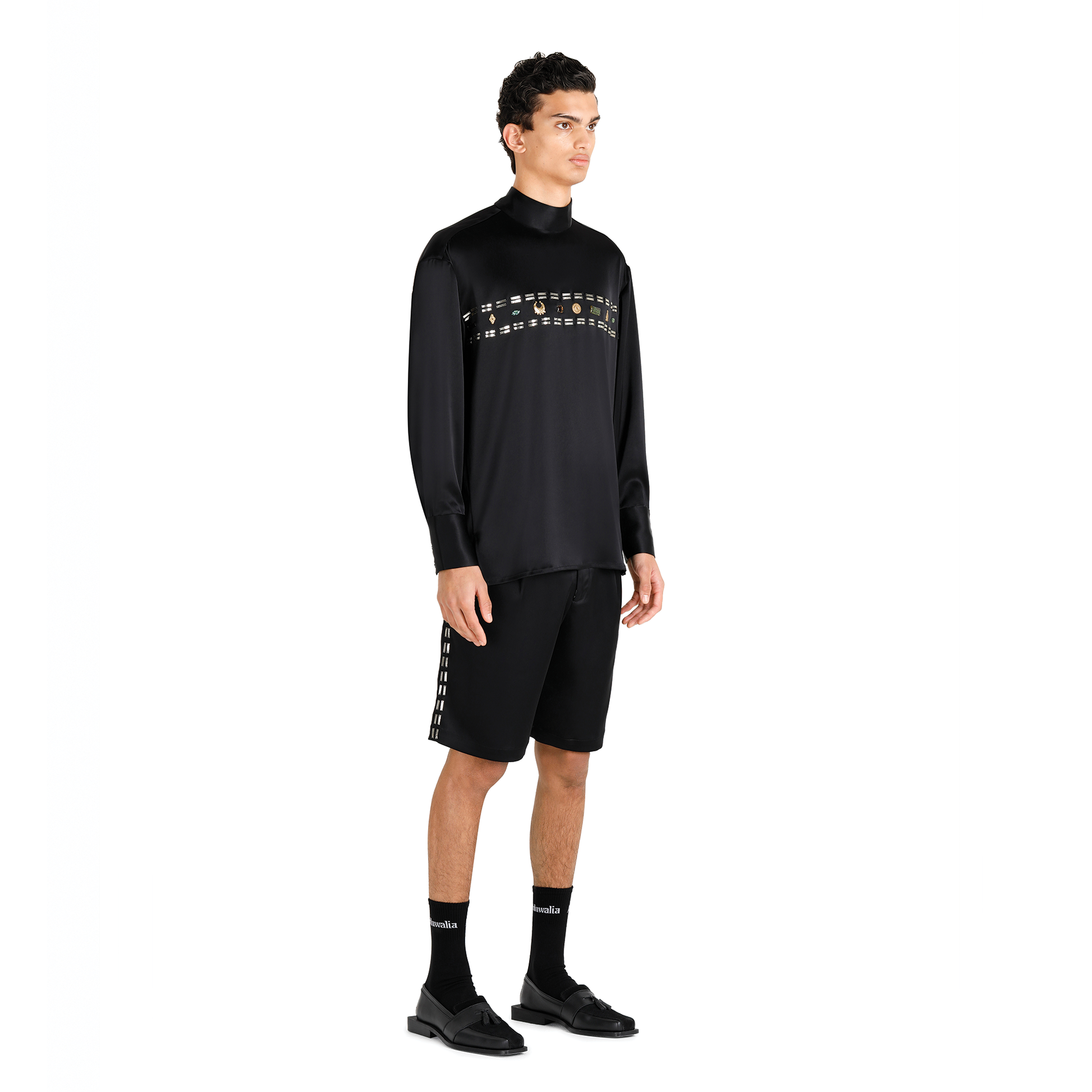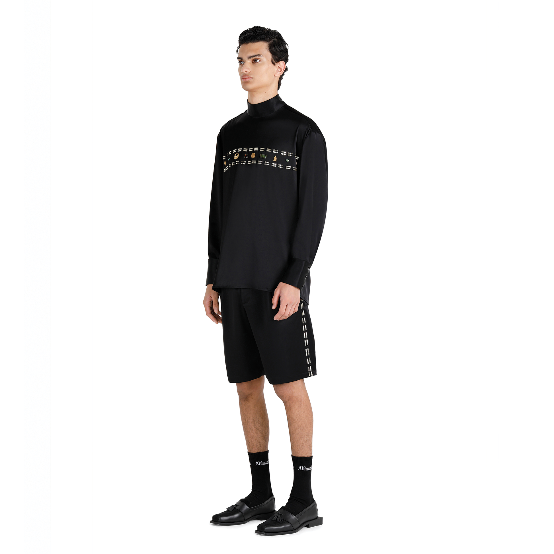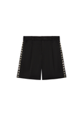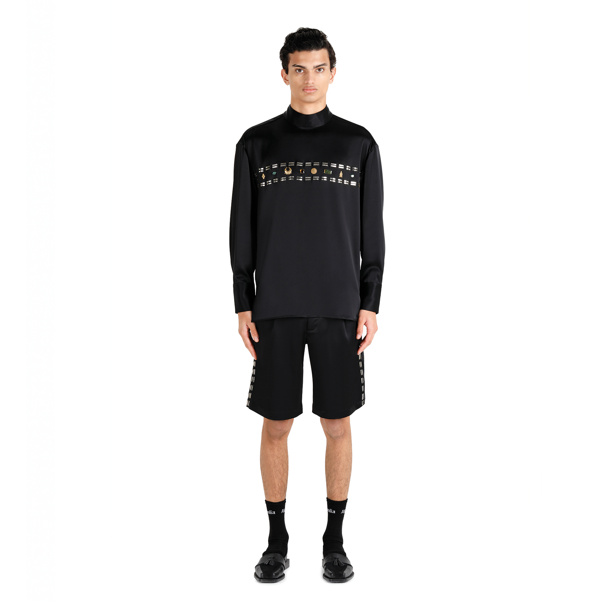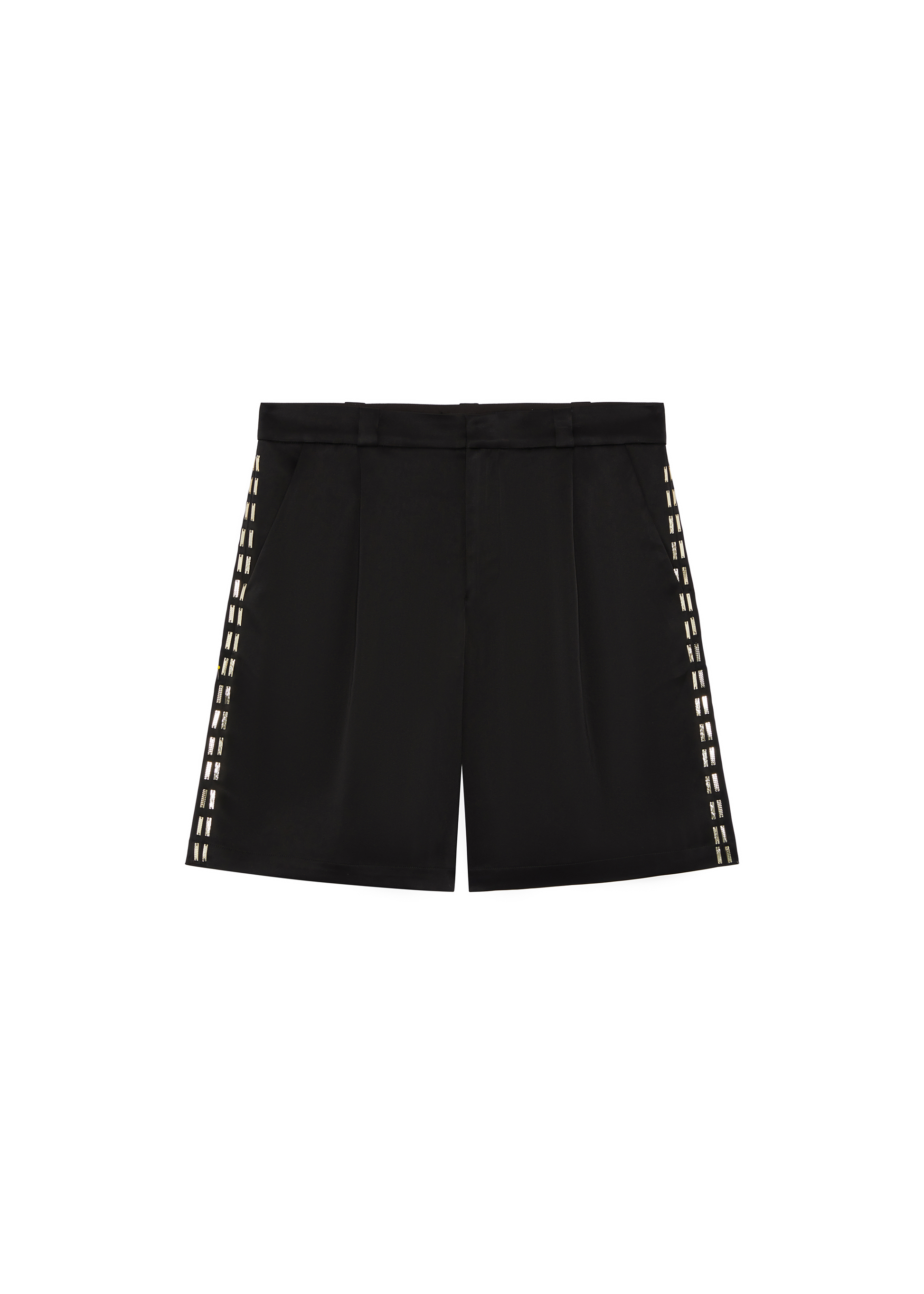 Inspired by traditional Indian embellishments, these tailored shorts feature intricate detailing along the side seams. Gold metal rectangles, metal gems, and resin-filled gems reflect the concept of conservation. Made from triacetate—a fabric derived from wood pulp, a natural raw material.