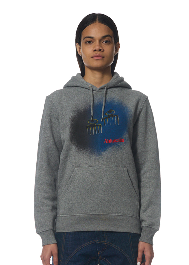 The Autumn Winter '21 Ahluwalia Nell hoodie is made from a soft, brush back organic cotton in grey, and features a printed graphic of a pair of Afro-combs against an ombre background with an embroidered Ahluwalia logo.
