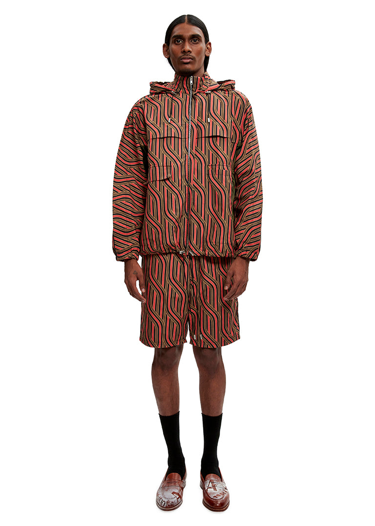 Ahluwalia’s Braid Raincoat is made from fabric weaved using 100% post-consumer plastic waste featuring the SS22 braid print. The Raincoat has a contrast back placket, drawstring hood, elasticated edges and multifunctional pockets.