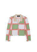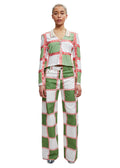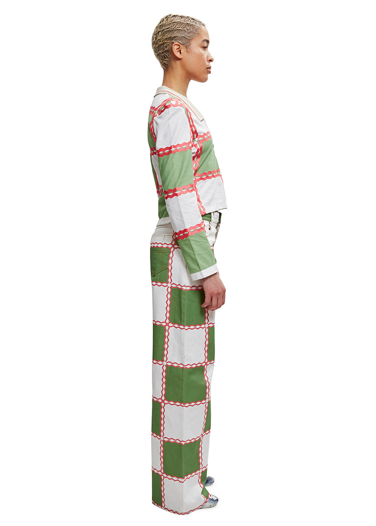 The Checkerboard print long-sleeved Jade polo top is crafted from 100% organic cotton piqué in tones of green and off-white, accentuated by a Georgia peach chain stitch. The Top is cut to finish above the hip and features Ahluwalia hardware, a half-zip up at the bust and a contrast beige, ribbed collar.