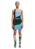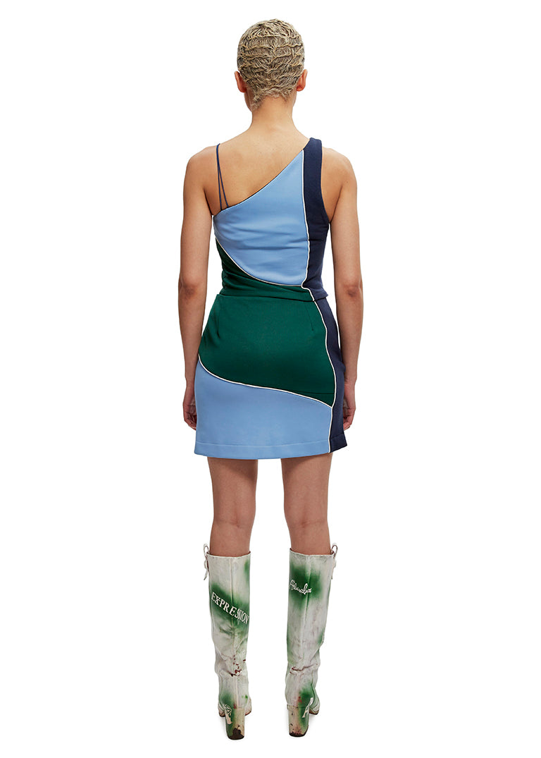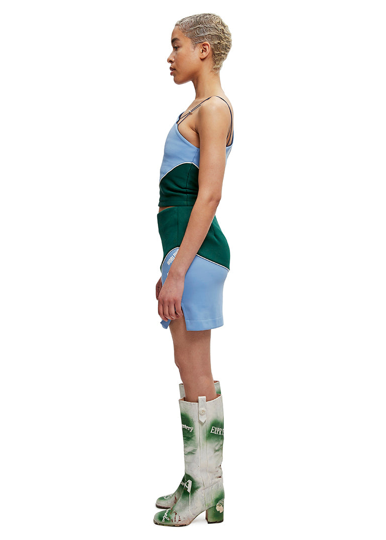 The use of recycled brushed back cotton sweat shirting lends an athletic aesthetic to SS22’s Twice as Nice skirt which also features the seasons ‘Worldwide’ vinyl artwork and a small side vent. The individual panels are finished with ecru piping whilst the skirt is fully lined in mesh for added comfort.