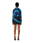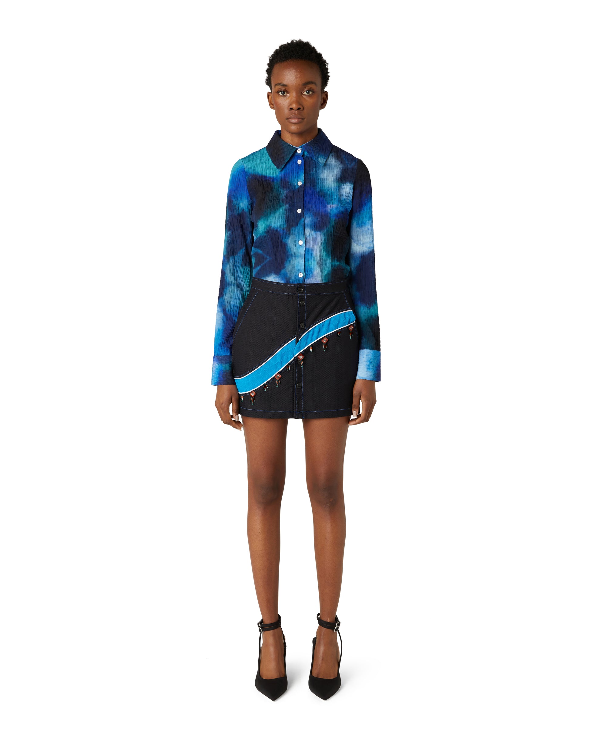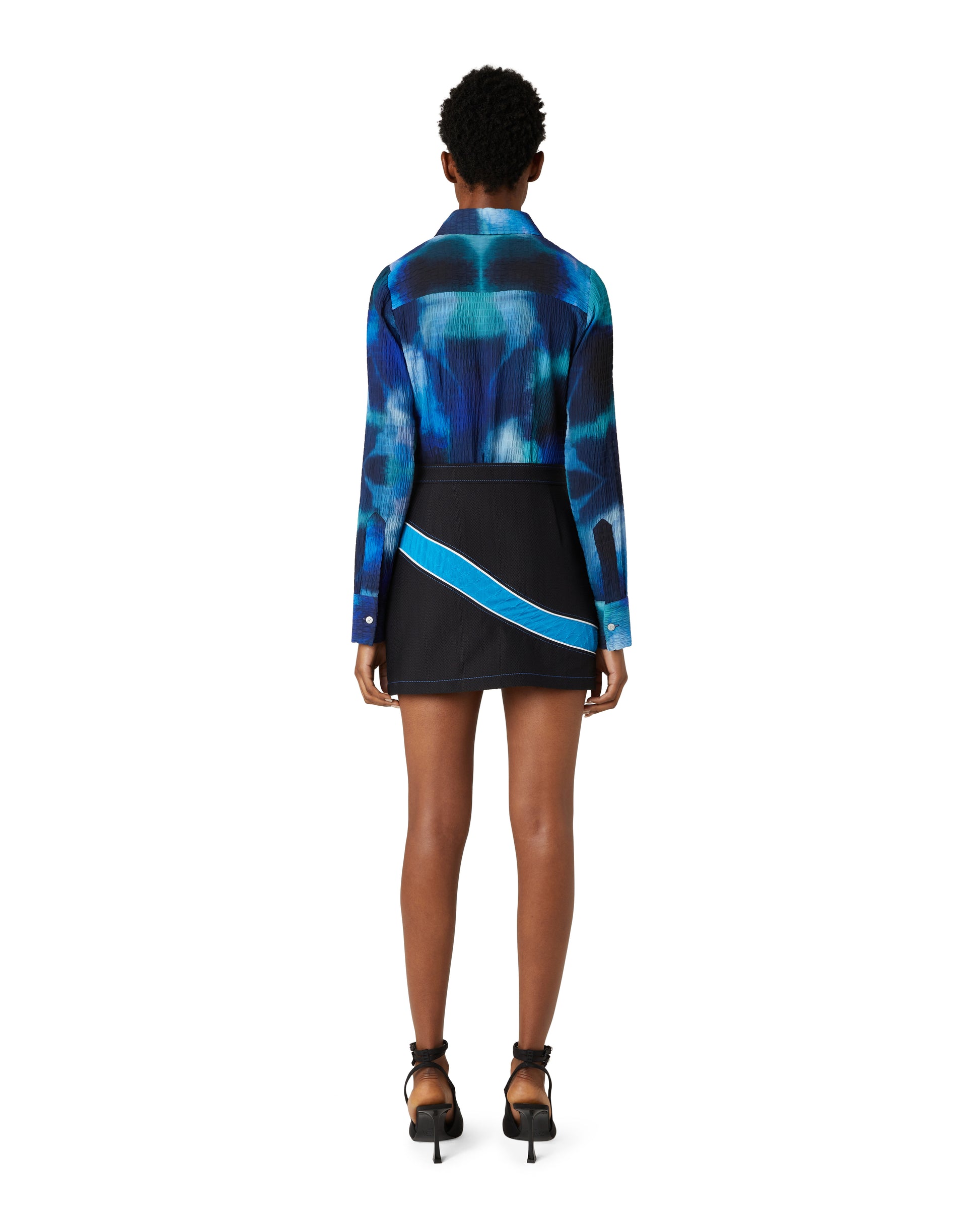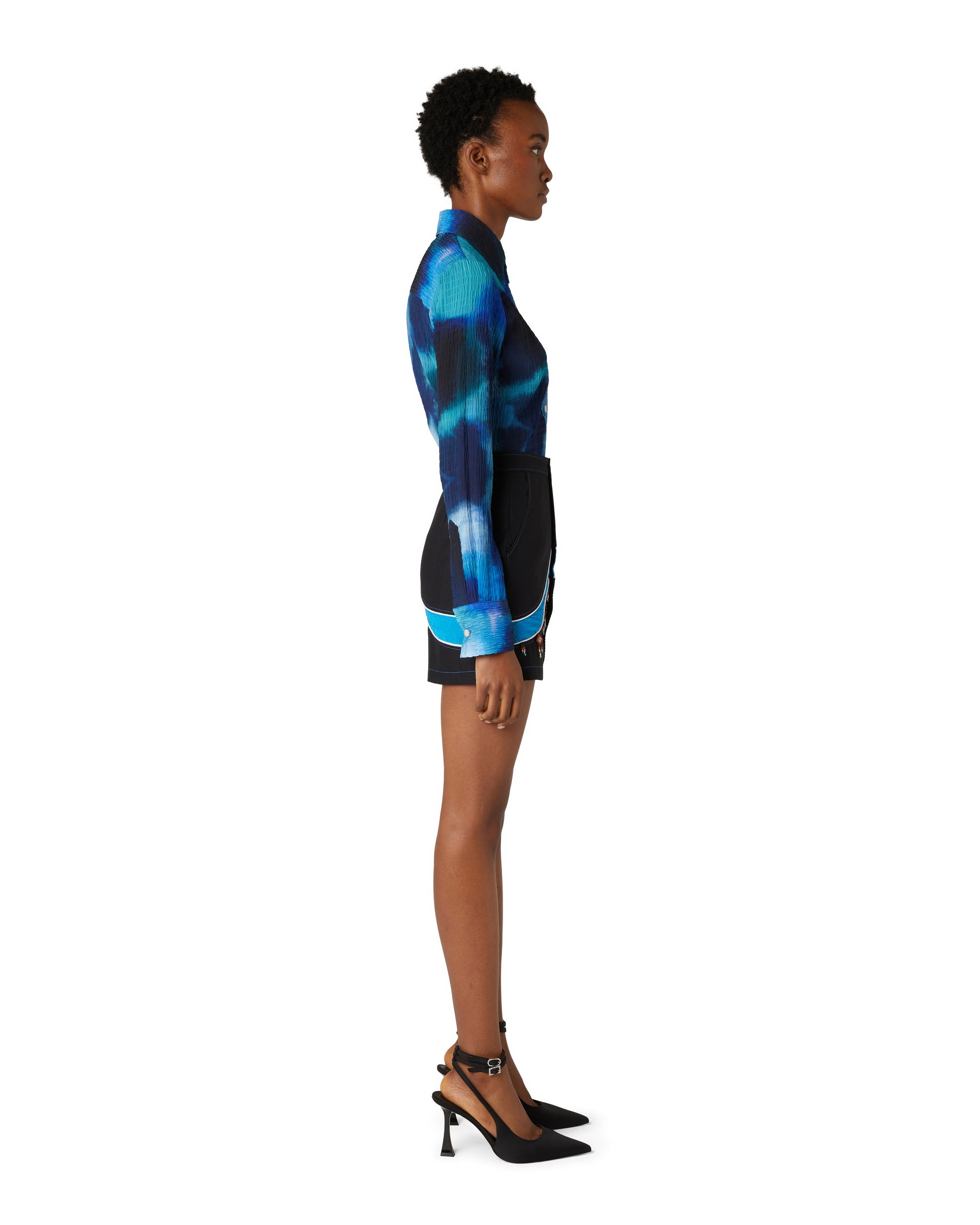 Koro Fitted shirt is cut from 100% shired crepe. It's made from viscose satin, with the signature wave print panelled and lined with a contrasting pink satin with ecru piping.