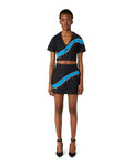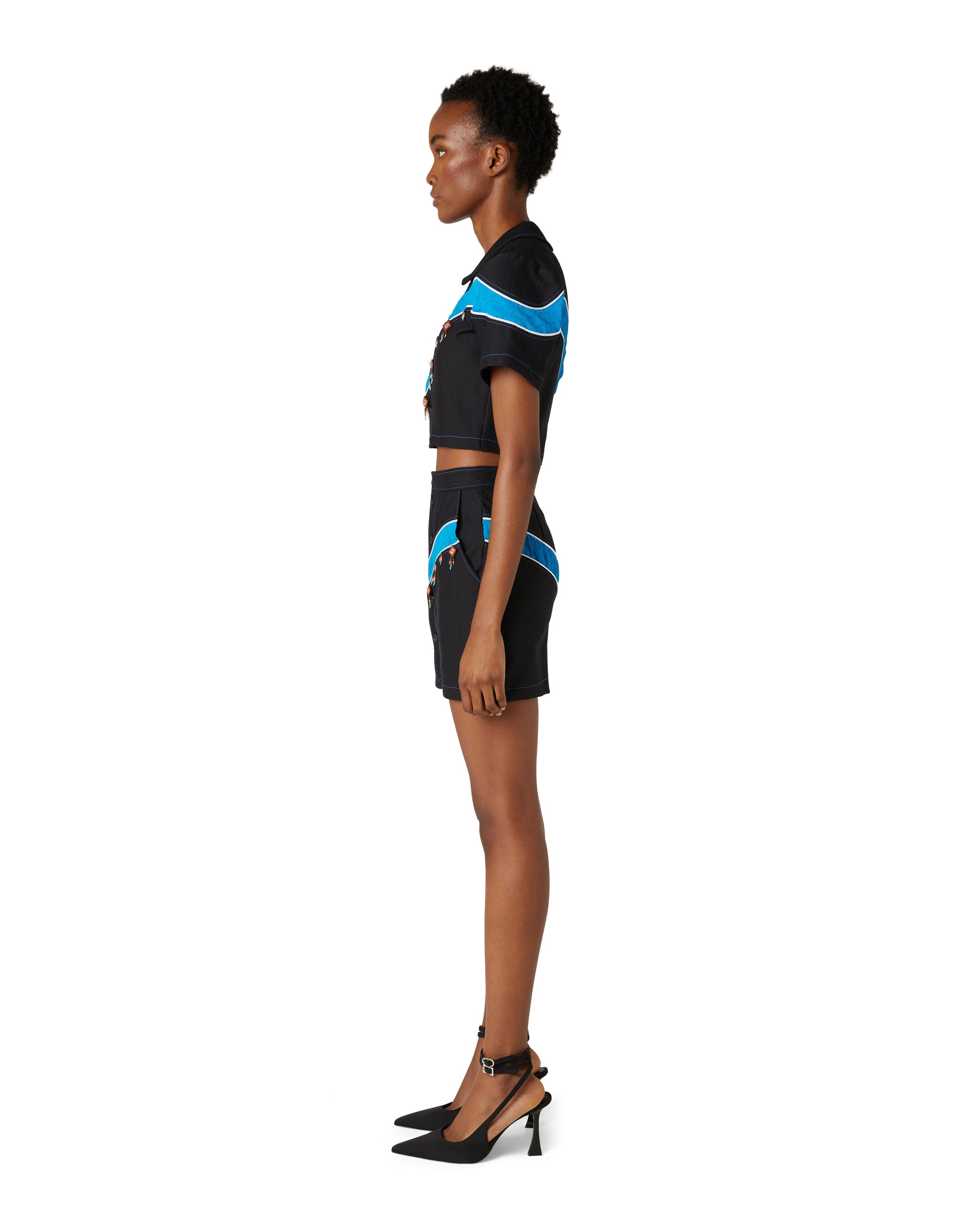 A new silhouette tailored from repurposed fabric for Ahluwalia brings the Priya Button Down Top featuring the signature wave lined with beading details, blue top-stitched French seams, and front button-down fastenings.