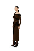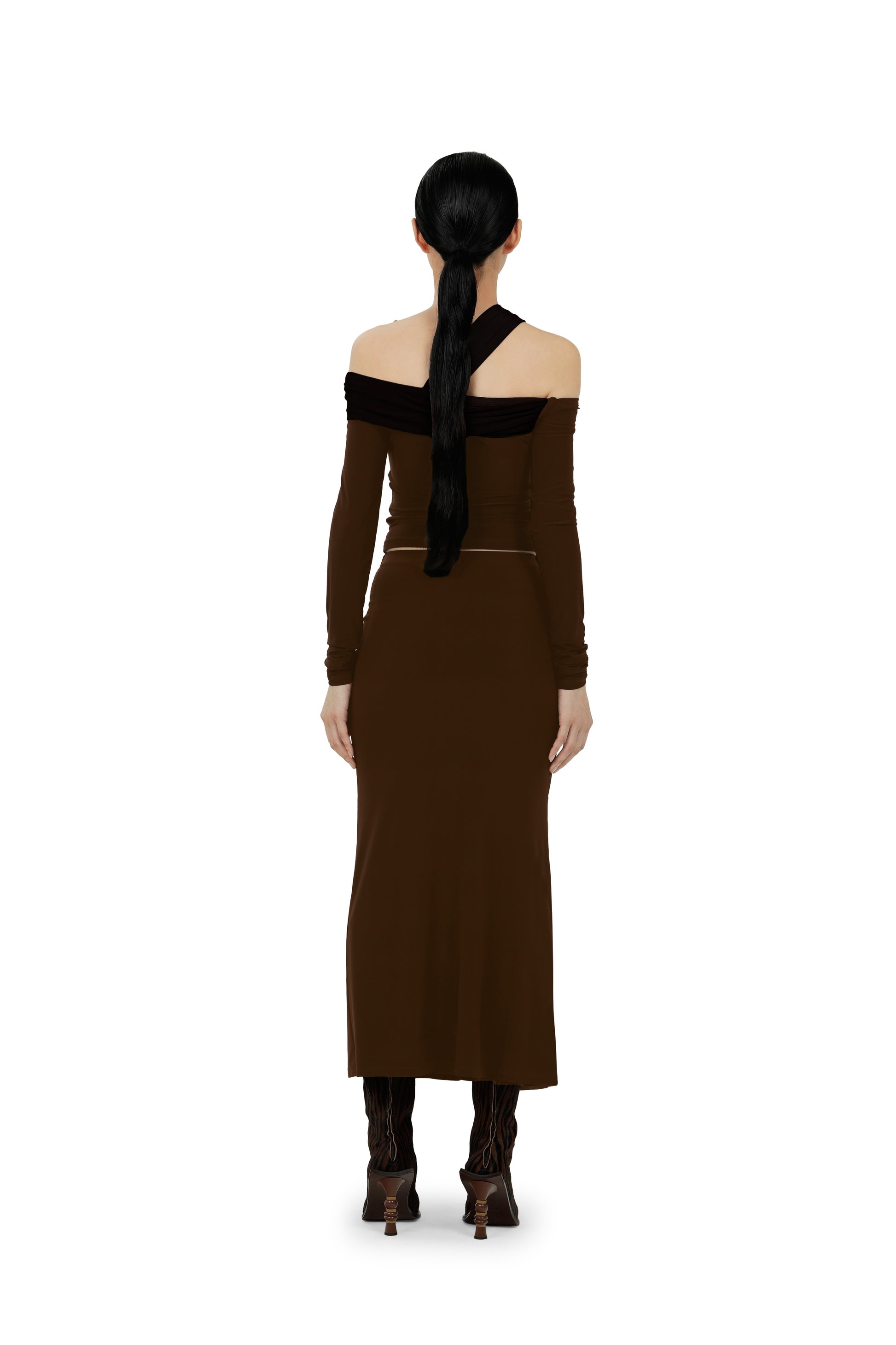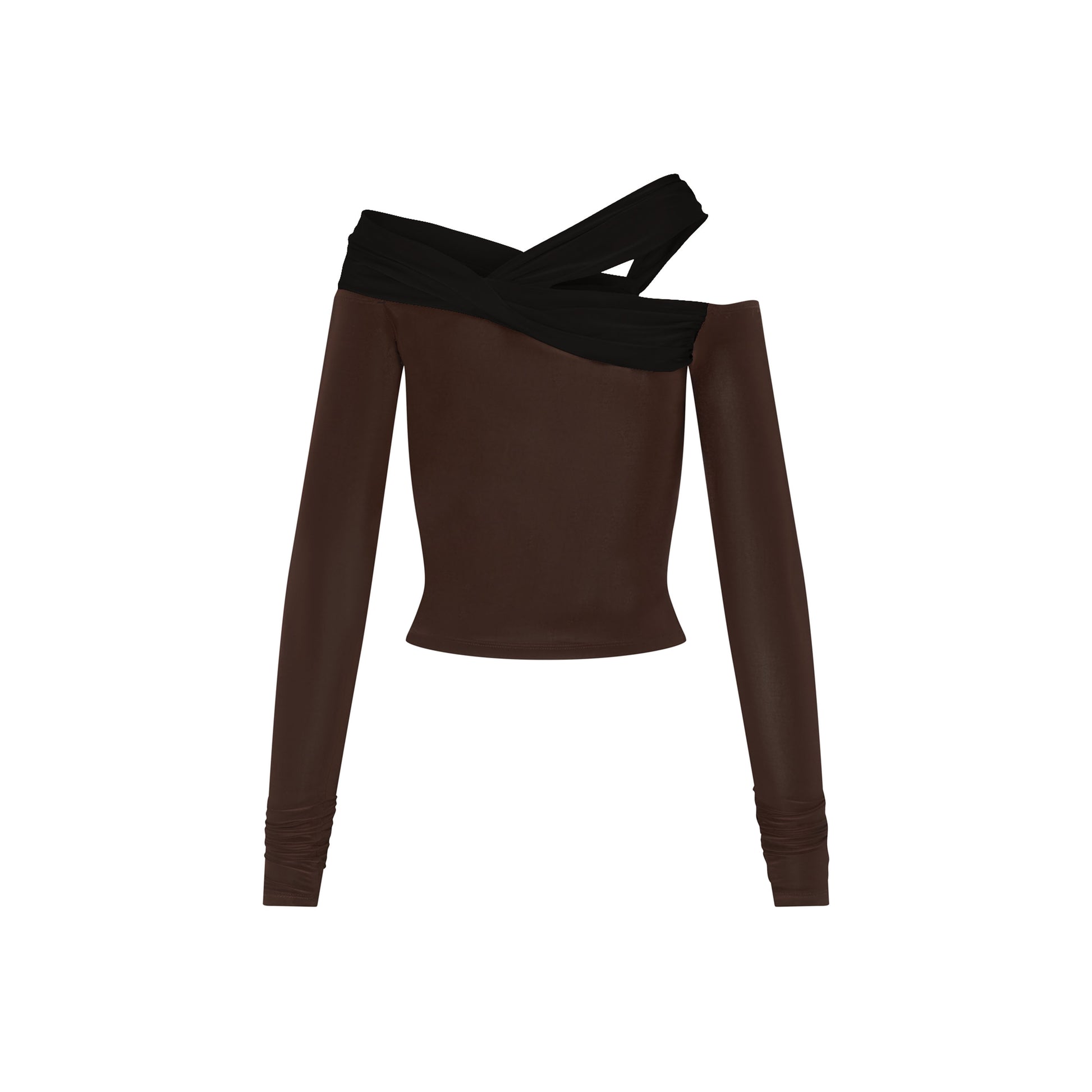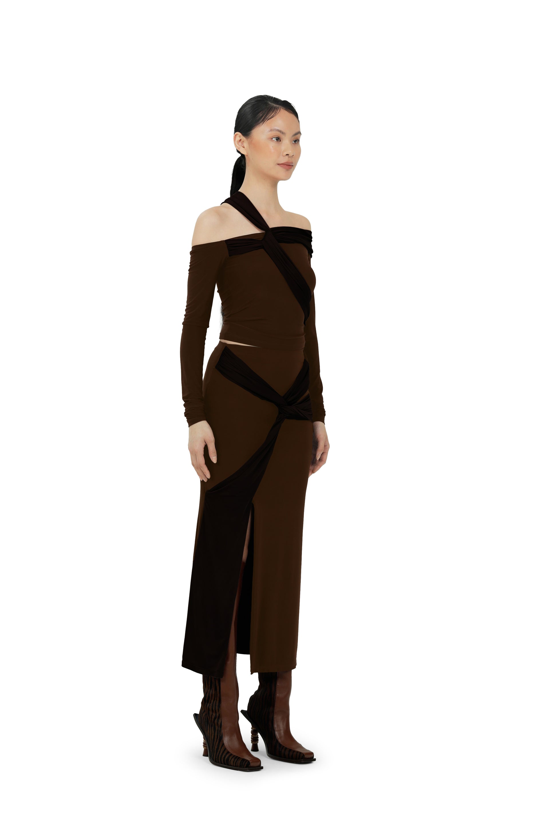 The Wonder Twist Top explores the collection’s theme of love and connectedness through its distinctive twisted strap detail. In a tonal brown, the strap wraps around the neckline, twists at the front, and extends over the shoulder for an asymmetric finish. Inspired by sculptural artworks, this piece transitions effortlessly from day to night.
